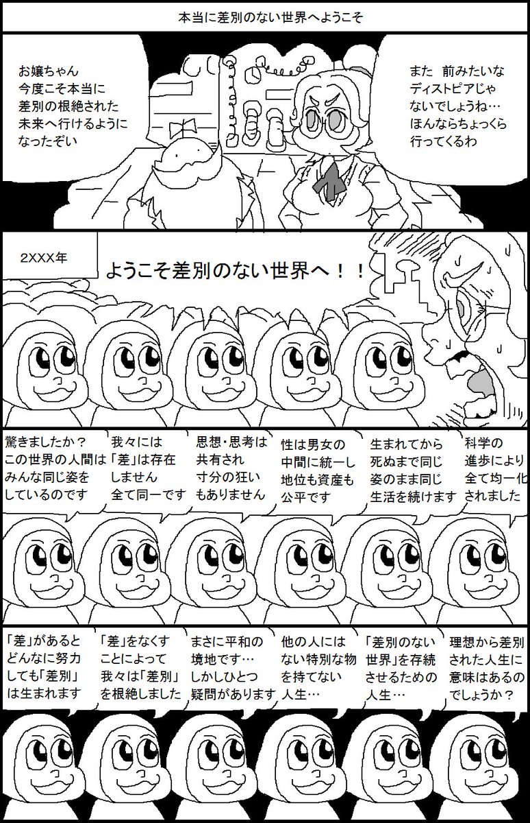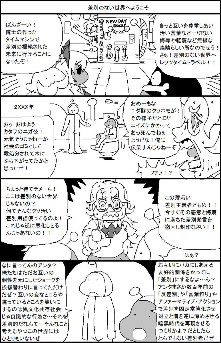 差別できない世界になったら人々は他人を罵倒する世界になるとか画一的な世界になるとか頓珍漢な発想してて馬鹿じゃねえの?